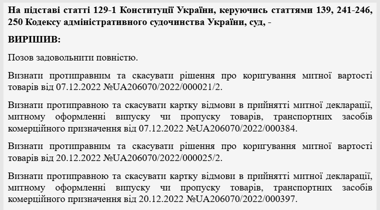 - У рішенні про коригування митної вартості товарів митним органом безпідставно та необгрунтовано вимагались банківські платіжні документи, на підтвердження митної вартості товарів;